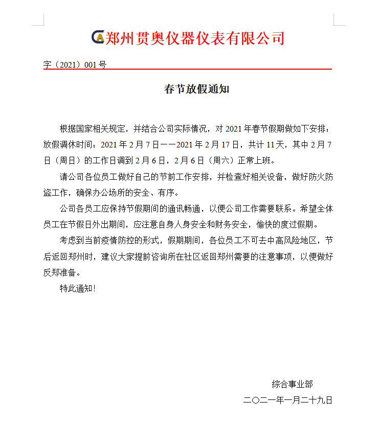 舊歲已展千重錦,新年再進(jìn)百尺竿。成績都是奮斗出來的!希望在2021年貫奧的各位家人能夠同心協(xié)力、共創(chuàng)佳績。同時根據(jù)國家的相關(guān)規(guī)定對于2021年春節(jié)放假做出以下安排: