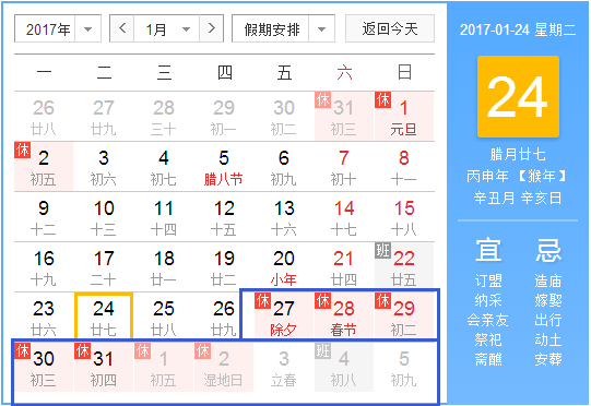 一、放假時間:2017年1月25日(農歷臘月二十八)至2017年2月5日(農歷正月初九),共計十二天,2017年2月6日(農歷正月初十)正式上班。